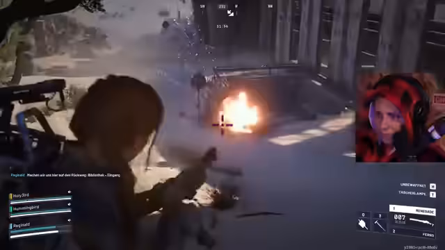 01:59:11Der Rocketeer-Dingsbums wird versehentlich aktiviert, was die Aufmerksamkeit der Gegner auf sich zieht. Die Gruppe versucht, von der Schusslinie wegzukommen, da die Gegner sehr nah sind. Es wird überlegt, zu einem Extraction Point zu gehen, aber der Versuch, über das Gebäude zu gelangen, wird fortgesetzt. Die Situation wird als brenzlig beschrieben, da der Hintern brennt und ein Feuerball die Nähe der Gegner bestätigt. Ein Spieler wird angeschossen, und es wird versucht, eine Zipline zu erreichen, wobei ein Fluch entweicht, der eigentlich vermieden werden sollte. Die Gegner sind sehr nah, und ein Spieler rennt um das Haus, während die Ausdauer knapp wird. Eine Rocket-Drohne pickt kurz an, aber der Spieler kann entkommen. Die Gruppe versucht, zum grünen Marker zu gelangen, während eine Sonde in der Nähe landet und eine Hornet angreift. Es wird nach dem Standort der Gegner gefragt, und die Anweisung 'Lauf, lauf, lauf' wird gegeben, um der Gefahr zu entkommen.