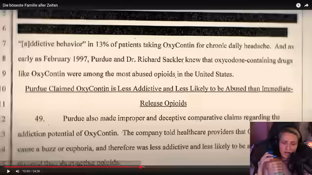 05:17:33Der Streamer analysiert, wie Medien und Unternehmen wie Purdue Pharma durch geschickt formulierte Leserbriefe und Grafiken die Öffentlichkeit täuschen. Sie zeigen angeblich geringe Suchtraten, doch Menschen hinterfragen solche Informationen selten kritisch. In der Masse sind Menschen leicht zu manipulieren, was Pharmakonzern und Ärzte nutzen, um Oxycontin als harmlos zu bewerben und durch Provisionen zu verkaufen. Diese Taktiken führen zu falscher Sicherheit bei Patienten.