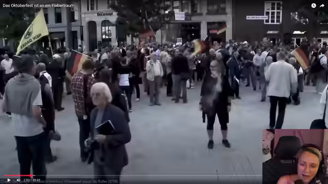 05:46:20Die Streamerin nimmt das Publikum mit auf eine imaginäre Reise zum Oktoberfest in München. Sie beschreibt den Andrang und die Gier der Gäste, die mit Decken und Thermoskannen Stunden vor Öffnung anstehen, um sich Plätze zu sichern. Regina vergleicht das Oktoberfest mit dem Kölner Karneval und kommt zu dem Schluss, dass es dort ähnlich zugeht, wenn nicht sogar schlimmer. Sie recherchiert den Ursprung des Festes: eine königliche Hochzeit am 12. Oktober 1810, die als Grund genommen wurde, um zu feiern und zu saufen.