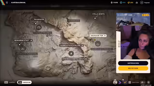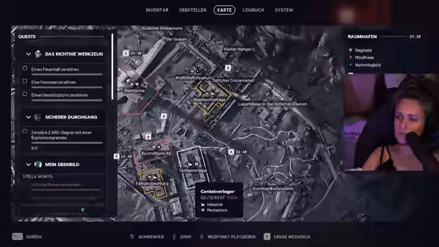 08:27:48Die Gruppe bespricht die nächsten Quests, darunter das Anfordern von Vorratsabwürfen und der Besuch eines Felddepots. Man entscheidet sich für die Mission, ein Felddepot zu besuchen, da diese Quest von mehreren Teammitgliedern geteilt wird. Als Map wird der Damm gewählt, da dort keine speziellen Events wie Nachtplünderungen oder Elektro-Stürme stattfinden. Mithilfe von Metaforge wird der genaue Standort des Felddepots auf der Karte ermittelt, um direkt dorthin zu gelangen. Es wird erwähnt, dass Felddepots immer an den gleichen Orten zu finden sind. Während der Vorbereitung wird über Munition und Rucksackkapazität gesprochen, wobei die Streamerin feststellt, dass sie ihren Rucksack noch nicht erweitern konnte, da dafür Stromkabel und Hornissentreiber benötigt werden, die selten sind. Die Gruppe macht sich bereit für den Aufbruch, wobei eine kurze Werbeunterbrechung für eine Pinkelpause eingelegt wird.