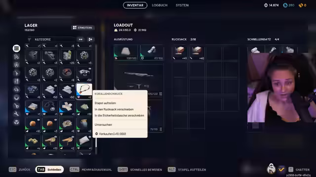 07:39:50Die Spieler sind erschöpft und haben kaum noch Energie oder Schildauflader. Sie versuchen, einen Extraktionspunkt zu erreichen, der bald schließt. Die Suche nach dem richtigen Eingang gestaltet sich schwierig, da viele Tore bereits geschlossen sind und Spinnen sowie andere Gegner den Weg versperren. Nach einem hektischen Sprint und mehreren knappen Situationen erreichen sie den Zug und entkommen. Ein Spieler lootet noch schnell eine Leiche im Zug, bevor dieser abfährt. Nach der erfolgreichen Extraktion widmen sich die Spieler der Lagerverwaltung. Es wird besprochen, welche Gegenstände verkauft oder recycelt werden sollten, um Platz zu schaffen und Ressourcen für Upgrades zu sammeln. Besonders wertvolle Gegenstände wie Korallenketten bringen viel Geld ein, während Saatgut und Stahlfedern aufgrund ihrer Häufigkeit bedenkenlos verkauft werden können.