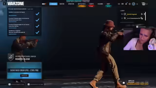 01:29:20Nach anfänglichen technischen Problemen mit dem Sound und den Kopfhörern, die durch einen Wackelkontakt verursacht wurden, beginnt die Streamerin mit dem Gameplay in Call of Duty. Sie spielt im Duo-Modus mit einem Daniel und diskutiert über das ständige Auftauchen von Gegnern in bestimmten Lobbys und verdächtige Aktivitäten, die sie auf Bots oder Cheater zurückführt. Der Fokus liegt auf dem Erbeuten von Ausrüstung und dem Bewältigen von Kampf Situationen. Einige Male wird sie von Gegnern überrascht, was zu Frust und lautem Äußern ihrer Reaktionen führt.