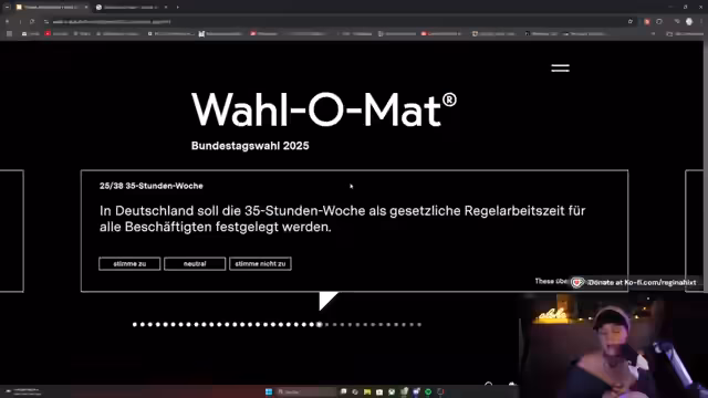00:28:28Die Streamerin greift Kommentare aus dem Chat auf, die sich kritisch über Politiker äußern, die nur auf ihren eigenen Vorteil bedacht sind und von Lobbyisten beeinflusst werden. Sie erwähnt alternative Antriebsarten und Wasserstofffahrzeuge, die ihrer Meinung nach von Öl- und Benzinkonzernen im Hintergrund blockiert werden. Sie kritisiert, dass sich Menschen mit viel Geld in die Politik einkaufen können und dass Medien gelenkt und korrumpiert werden. Sie erwähnt den Wahl-O-Mat und den Reel-O-Mat, die von demselben Institut erstellt wurden, wobei der Wahl-O-Mat nach den Wahlprogrammen der Parteien geht und der Reel-O-Mat nach dem tatsächlichen Abstimmungsverhalten der Abgeordneten. Sie äußert Frustration darüber, dass sie sich als Entertainerin nun auch noch mit Politik auseinandersetzen muss, da sie sich nicht richtig und transparent informiert fühlt. Sie betont, dass sie sich in der Verantwortung sieht, sich zu informieren, um mitreden und sich beschweren zu können. Sie lädt die Zuschauer ein, mitzulernen und sich respektvoll an der Unterhaltung zu beteiligen. Sie macht den Wahl-O-Mat für sich selbst, um herauszufinden, welche Parteien ihre Interessen unterstützen.