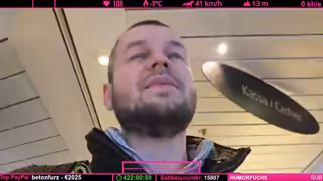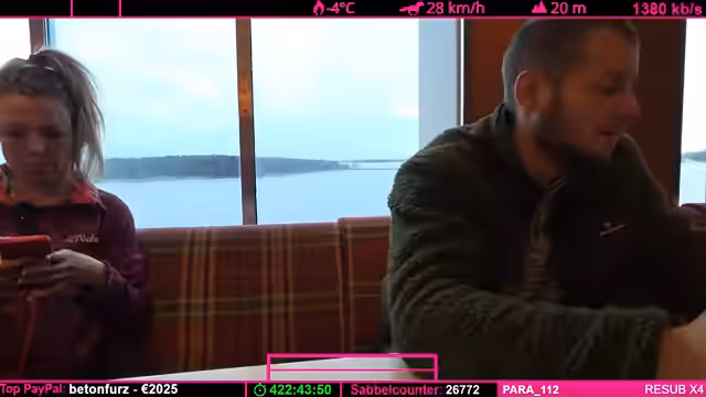 02:06:49Die Suche nach einem freien Platz auf der überfüllten Fähre gestaltet sich als schwierig. Der Streamer versucht, einen stabilen Sitzplatz zu finden, um die Kamera aufzustellen. Parallel dazu wird die Internetverbindung weiterhin gescannt, aber das gewünschte Telenor-Maritim-Netzwerk ist nicht verfügbar. Es wird überlegt, ob man das Essen an einen Tisch bringt, während technische Probleme mit der Kamera und der Tonqualität bestehen bleiben. Die Verbindung bleibt instabil, was die Zukunft des Streams ungewiss macht.