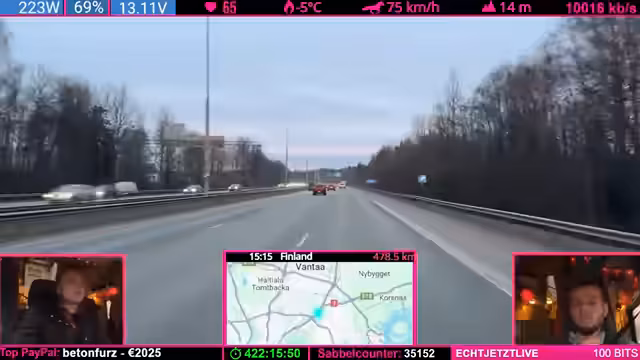 10:34:46Die Ankunft in Finnland wird gefeiert und ein Raid auf den Kanal 'ApeTour25' durchgeführt. Die Fahrt geht weiter in Richtung Rovaniemi. Ein wichtiges Thema ist die Suche nach einer geeigneten Raststätte für die Nacht. Der Streamer überlegt, ob er direkt an der Straße oder etwas weiter abseits parken soll, was einige Minuten in Anspruch nimmt, bevor eine Entscheidung für einen Ort in etwa 31 Minuten Fahrtzeit getroffen wird.