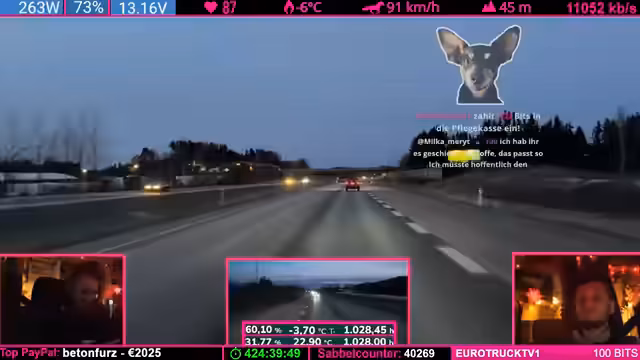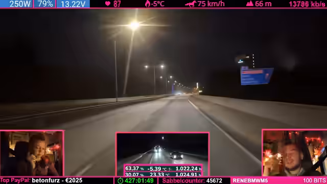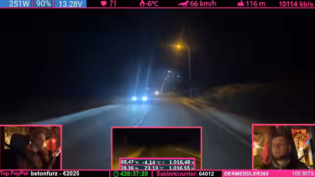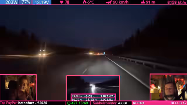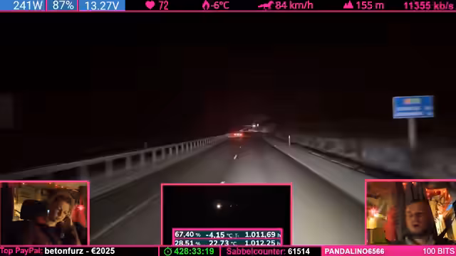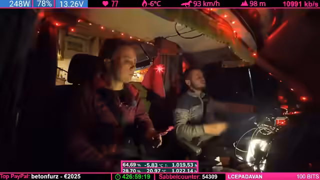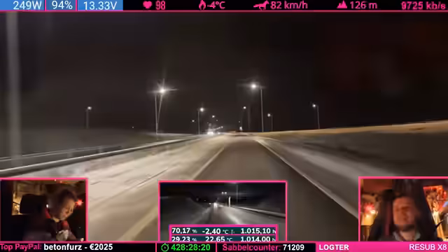 08:57:45Die Weiterfahrt zum Weihnachtsdorf steht an, doch es gibt keine Hetze. Der Streamer plant, am nächsten Tag weiterzufahren, um pünktlich anzukommen. Er nimmt in Kauf, dass das Dorf möglicherweise geschlossen sein könnte, und will es sich auf keinen Fall extra dafür antun. Die Reise entspannt sich und der Fokus verlagert sich vom Stress der Ankunft auf das gemeinsame Erlebnis der Fahrt selbst.