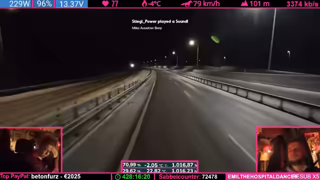 04:20:54Der Streamer zieht ein persönliches Fazit der bisherigen Reise. Trotz technischer Probleme und anstrengender Momente wird die positive Resonanz bei Polizeikontrollen hervorgehoben. Es folgen abschließende Gedanken zum Datenschutz und zur Überwachung in verschiedenen Ländern, wobei die Situation in Deutschland kritisch betrachtet wird. Der Stream endet mit der Hoffnung, den Laptop bald zurückzuerhalten und die Reise fortzusetzen.