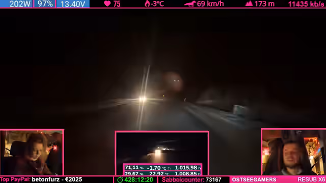 00:12:00Während der Fahrt lässt Frustration über rücksichtslose Verkehrsteilnehmer nach. Der Streamer beschreibt einen beängstigenden Moment, bei dem ein anderes Fahrzeug extrem dicht auffährt und einen potenziellen Unfall auslöst. Seine Reaktion ist wütend und scharf, er bezeichnet den anderen Fahrer explizit als "Drecksack" und "Arschloch". Dieses Ereignis verdeutlicht die psychische Belastung während langer Fahrten und die Unvorhersehbarkeit des Straßenverkehrs.
