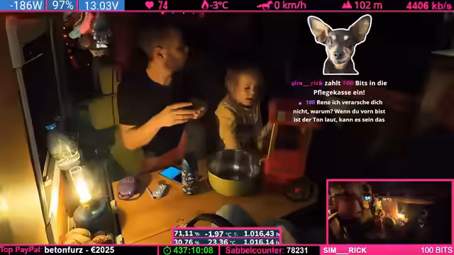 07:03:43Nach dem Baumarkt wird die neue USB-Ladetischlampe getestet und als atmosphärische Beleuchtung für den Stream gelobt. Es gibt jedoch Herausforderungen: Das Tablet des Kindes wird kurzzeitig vermisst, und der Internet-Router stürzt ab, was eine Unterbrechung verursacht. Gleichzeitig wird die Notwendigkeit von Powerbanks und Ladekabeln betont, um die Geräte während der Fahrt betriebsbereit zu halten. Diskussionen über korrektes Laden (z. B. mit Power Delivery) und das Organisieren von Ladekabeln zeigen die praktischen Hürden im Alltag. Ein weiterer Fokus liegt auf dem Schuhchaos im Wohnmobil, das durch einen selbstzugeschnittenen Abstreicher gelöst werden soll.