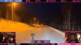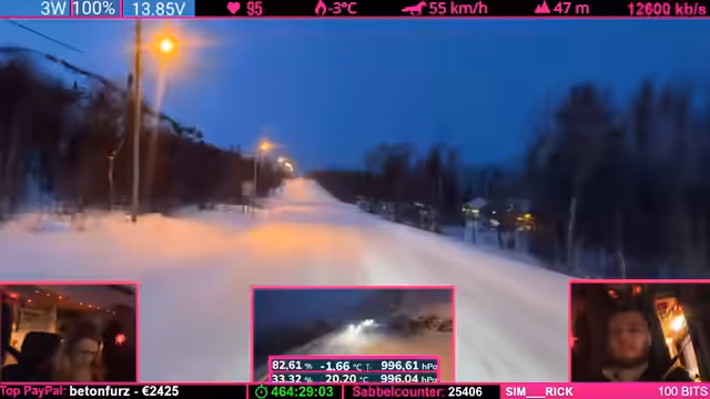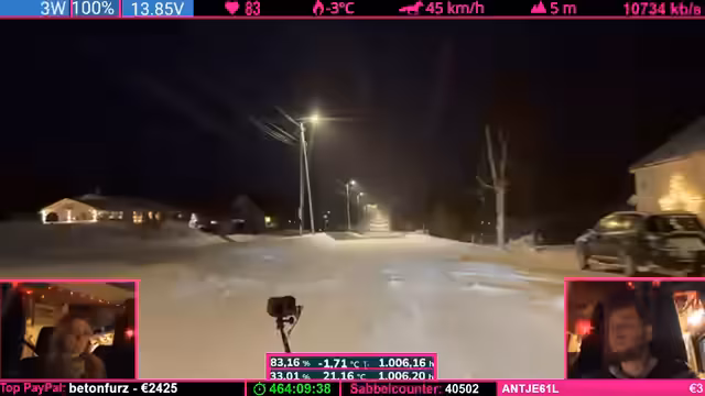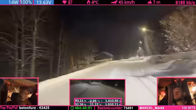 03:28:58Während der Fahrt durch die Polarnacht kommt es zu einem Beinaheunfall, wobei ein anderes Fahrzeug sich hinter dem Streamer dreht. Die seltene Kombination aus der vorherigen Warnung und dem tatsächlichen Ereignis im Stream führt zu einer intensiven Diskussion im Chat über die Wahrscheinlichkeit und mögliche Vorfälle. Auch technische Probleme der Fahrzeugkamera, die ihren Winkel ändert, werden angesprochen, sowie die Herausforderungen bei der Begegnung mit winterlichem Winterdienst und Schneefräsen auf engen Straßen.