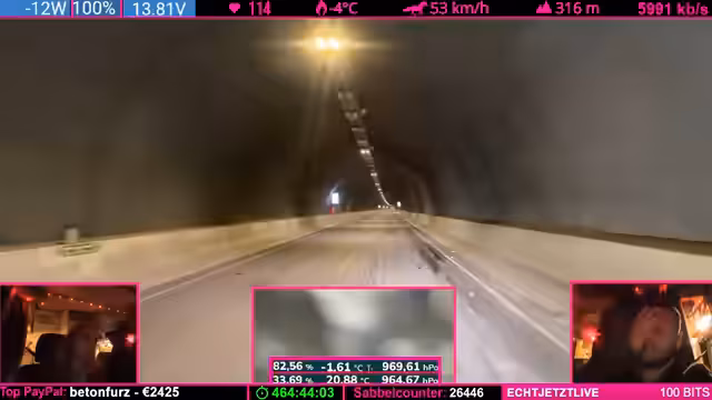 06:09:31Ein kurzer Tunnel bietet eine willkommene, aber nur kurze Pause vom Schneegestöber. Doch direkt danach verschlechtert sich die Lage erneut dramatisch. Ein vorausfahrendes Wohnmobil gerät in einen White-Out, einen Zustand absoluter Orientierungslosigkeit durch Schneeverwehungen. Der Fahrer des Streamers verliert ebenfalls jegliche Sicht und muss sich ausschließlich an der Leitplanke orientieren. Er erzählt von einem schweren Unfall, den sie kurz zuvor gesehen haben, bei dem eine Fahrerin von der Straße abkam, und warnt vor der hohen Gefahr, die von den Bedingungen für alle Verkehrsteilnehmer ausgeht.