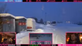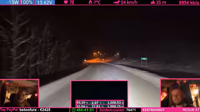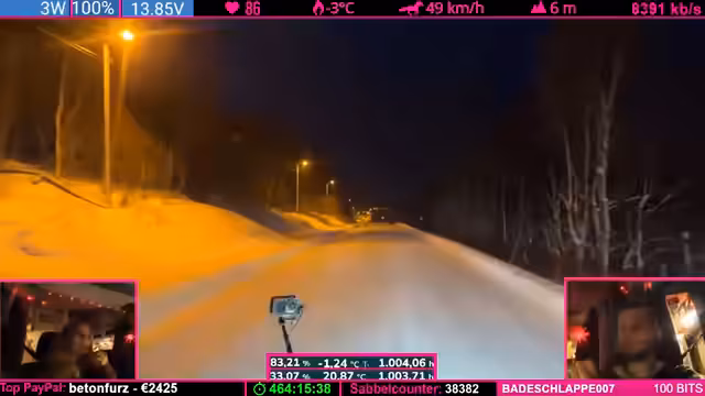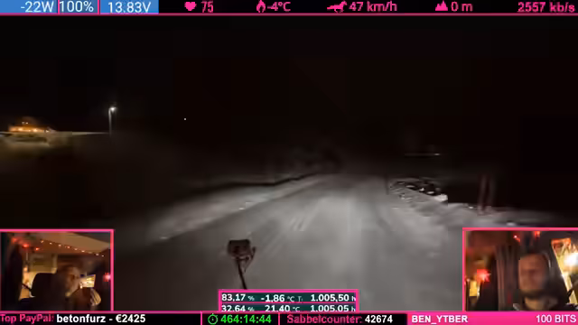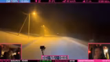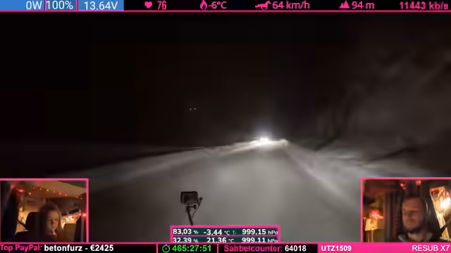 04:29:42Die Reise führt durch ein extrem starkes Schneegestöber. Die Sichtverhältnisse sind dermaßen eingeschränkt, dass die Straße kaum noch zu erkennen ist. Der Streamer beschreibt, wie er nur langsam fahren muss, um sicher zu bleiben, und kritisiert das unprofessionelle Ruckeln der Rückkamera, die durch Vereisung und Schnee bedingt ist. Er überlegt, die Kamera abzuschalten, da sie durch den zugeschneiten Eispanzer fast kein Bild mehr liefert und die Fahrsituation zusätzlich verschlechtert.