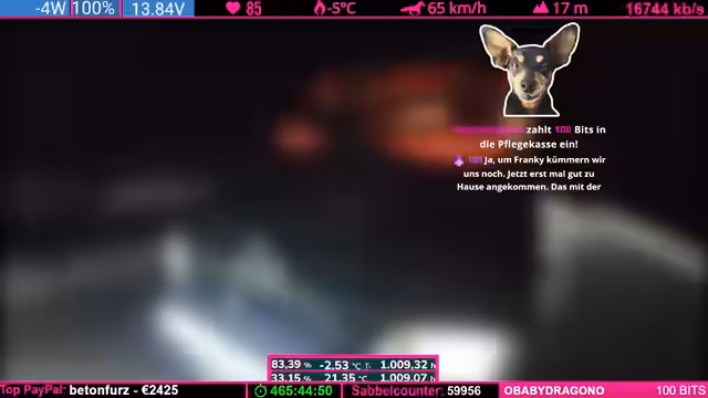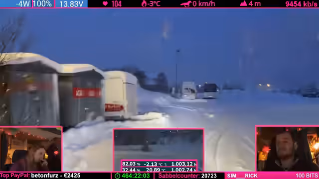 01:42:57Die Streamer interagieren intensiv mit dem Chat, wobei sie auch auf wiederkehrende Audio-Dateien und deren Auswirkungen auf das Streaming eingehen. Es kommt zu technischen Problemen mit dem Stream, da durch das Vereisen der Kameras das WLAN instabil wird und die Bildqualität nachlässt. Auch die Mikrofone sind von der Kälte betroffen. Zudem finden unvorhergesehene Stopps statt, um das Auto von Eis zu befreien und die Sicht zu verbessern, was jedoch nur vorübergehend hilft.