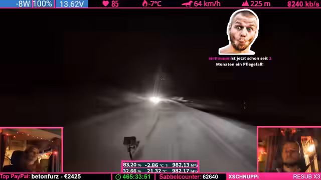 07:12:23Die meteorologischen Bedingungen bleiben äußerst ungemütlich. Der Schneesturm hat zwar kurz nachgelassen, der Zustand des Streamers hat sich jedoch weiter verschlechtert. Er klagt über Übelkeit, Schweißausbrüche und Schwindel, die auf die starken Belastungen während der Fahrt zurückzuführen sind. Das Stresslevel und die körperlichen Beschwerden sind so hoch, dass er kaum in der Lage ist, weiterzufahren, und eine ärztliche Behandlung dringend notwendig scheint. Die Fahrt wird zu einer Tortur.