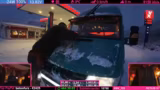 04:02:45Nach einem erfolgreichen Tankvorgang hat der Streamer weiterhin Schwierigkeiten mit der vereisten Tür des Fahrzeugs und dem Gummi der Tankklappe, die einfriert. Auch die Heckscheibenwischer bereiten Probleme. Die Weiterfahrt gestaltet sich durch starken Schneefall und die rutschige Fahrbahn anspruchsvoll, wobei der Streamer bei scharfen Kurven driften und Spaß an der Fahrt hat.