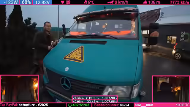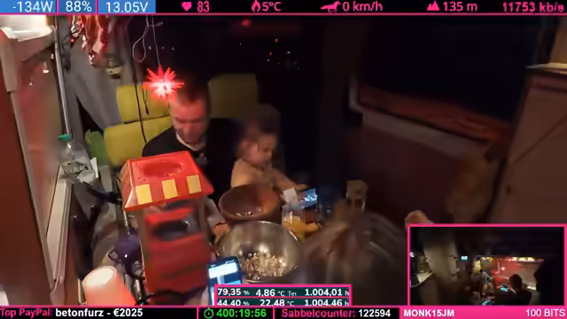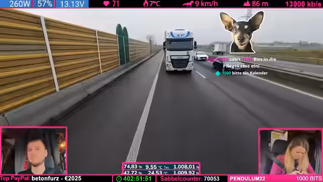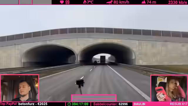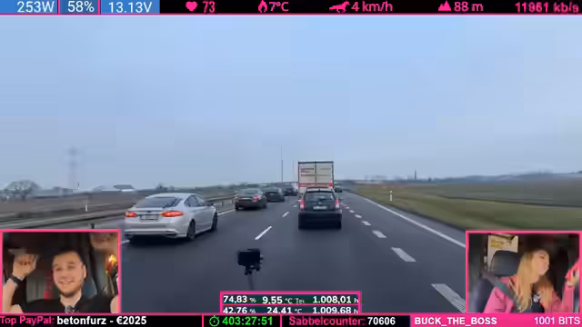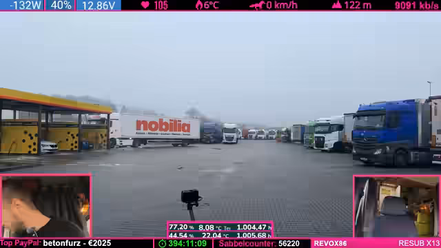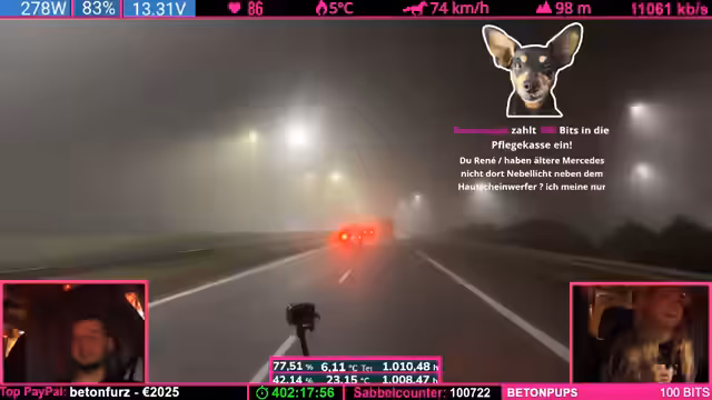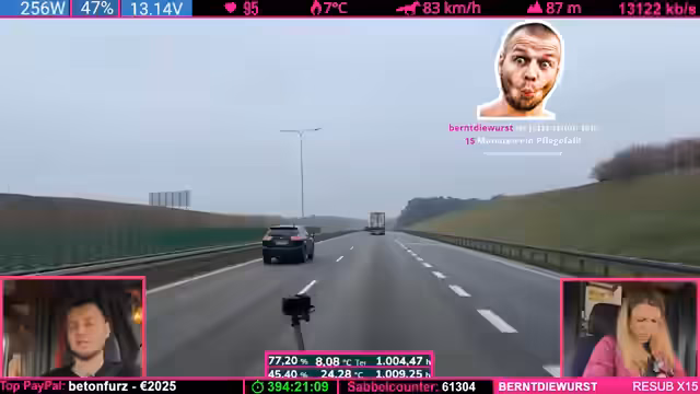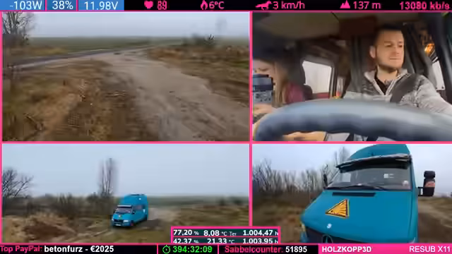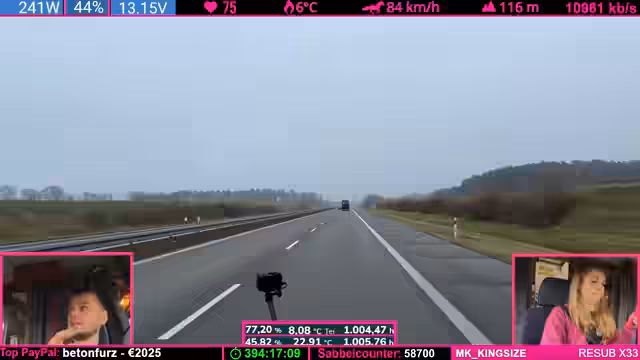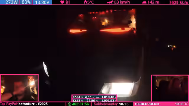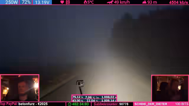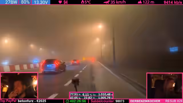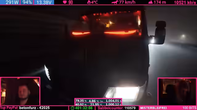 07:33:38Zwischen technischen Diskussionen wurde der Austausch mit der Community fortgesetzt. Themen wie die Verteilung von Postkarten an langjährige Supporter, der Umgang mit Moderatoren im Chat und lustige Anekdoten aus früheren Streams lockerten die Stimmung auf. Gleichzeitig wurde die Route angepasst, um Gasquellen effizienter anzusteuern, und über die schlechte Beleuchtung des Sprinters geklagt. Der Streamer kündigte außerdem an, bald mit dem Kochen zu beginnen und dafür eine Brustkamera einzusetzen.
