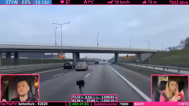 03:01:55Während der Fahrt werden die weihnachtliche Atmosphäre mit Schnee und passender Musik thematisiert, wobei der Moderator seine persönliche Beziehung zu Weihnachten erläutert. Parallel dazu wird auf die instabile Internetverbindung in Polen eingegangen, die auf mangelnden Netzausbau und geringe Bevölkerungsdichte zurückgeführt wird. Lösungsvorschläge wie Starlink werden diskutiert und verworfen, da sie bei Brückendurchfahrten nicht funktionieren würden.