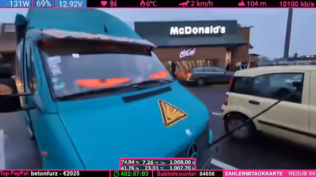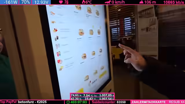 05:18:29Während der Fahrt wird ein Stopp bei McDonald's eingelegt, um Kaffee zu holen und zu essen. Der Drive-in ist aufgrund der Fahrzeuggröße nicht nutzbar, daher muss das Team ins Restaurant. Der Bestellvorgang gestaltet sich chaotisch, besonders durch die große Anzahl an Mitarbeitenden und die hohe Auslastung des Ladens. Parallel gibt es Diskussionen über die effiziente Organisation vor Ort und technische Probleme mit der Streamqualität während des Aufenthalts.