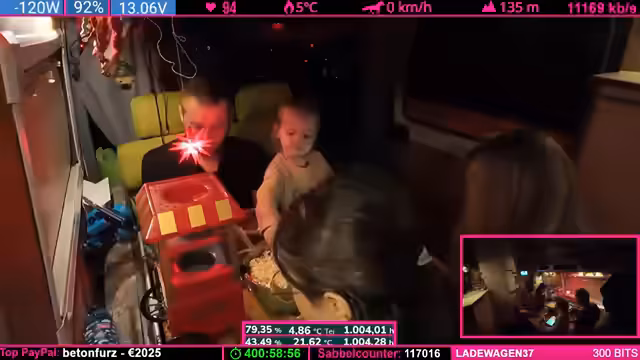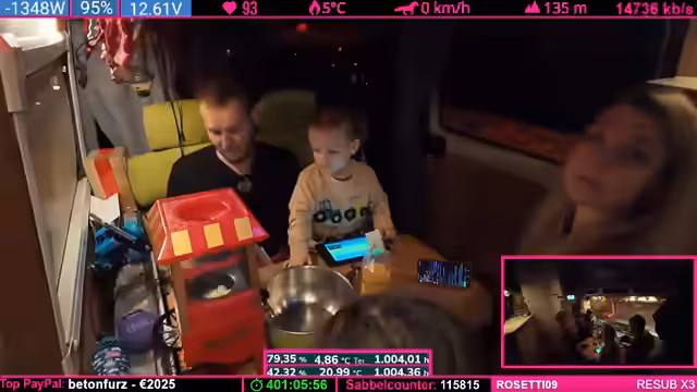09:33:40Die Familie erreicht schließlich den geplanten Schlafplatz. Müdigkeit und gesundheitliche Probleme wie Erkältungssymptome prägen die Stimmung. Während des Aufbaus werden letzte technische Anpassungen am Kamerasetup vorgenommen. Die Kinder zeigen sich erschöpft, und die allgemeine Frustration über die gescheiterten Versuche, Gas zu beschaffen, ist spürbar. Pläne für den nächsten Tag bleiben vage, mit Fokus auf Norwegen als nächste Lösungschance.