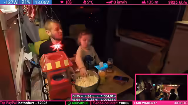 00:13:12Der Stream beginnt mit einer chaotischen Morgensituation. Alle Familienmitglieder sind erkältet, der Streamer hat kaum geschlafen und bereitet ein Frühstück für sein Kind zu, das jedoch nicht essen möchte. Er zeigt einen selbst erstellten Tischkalender, von dem lediglich 100 Exemplare gedruckt wurden, und plant für den Tag Drohnen-Testflüge sowie Reparaturen am Camper.