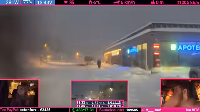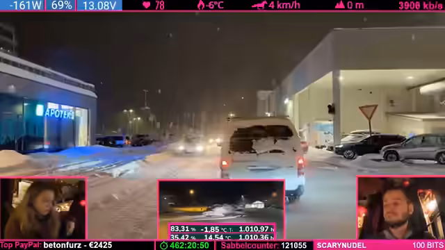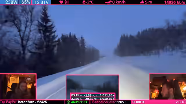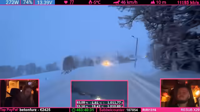 04:51:45Während der Fahrt stellen sich technische Probleme ein, die Internetverbindung via Starlink und LTE ist schwach oder weg. Der Streamer nutzt die Zeit, um den weiteren Fahrtplan zu besprechen. Die Strecke über die E8 wird als der "gute Weg" eingestuft, aber auch hier besteht die Gefahr, dass die Fahrt durch Schneeverhältnisse noch länger wird und der Zeitplan, der auf elf Stunden Fahrzeit ausgelegt ist, knapp wird.