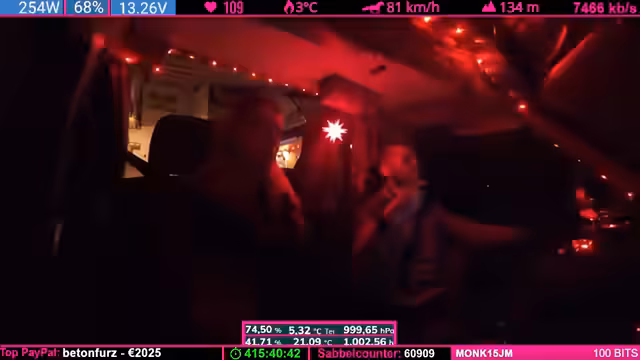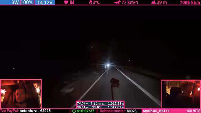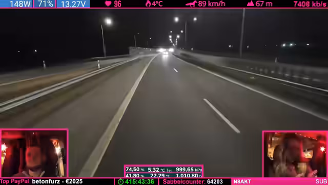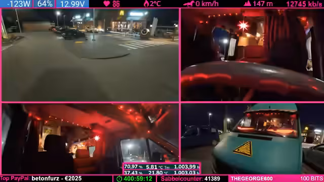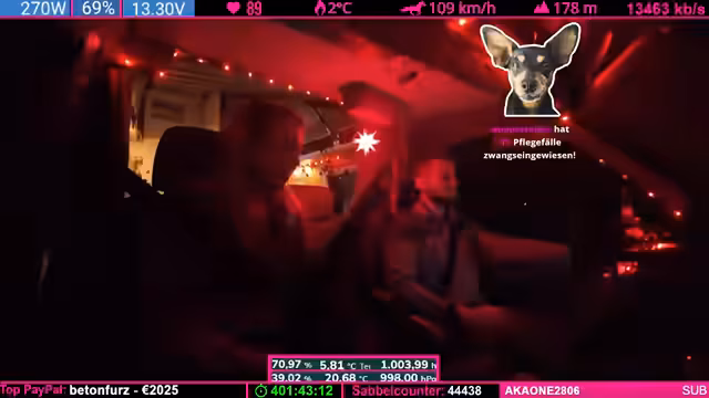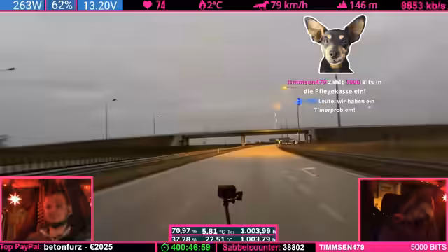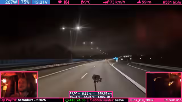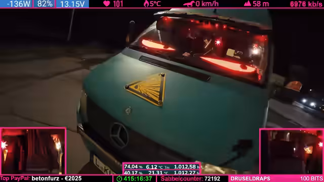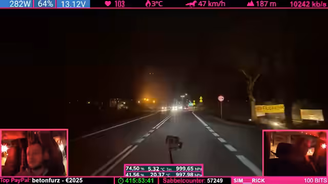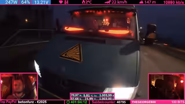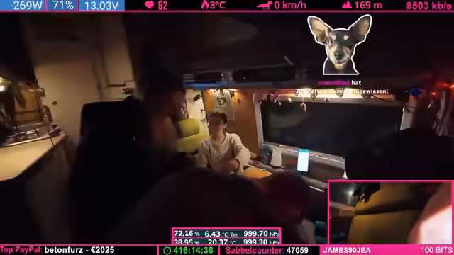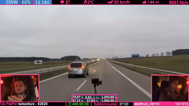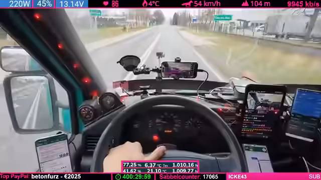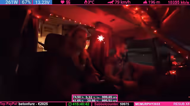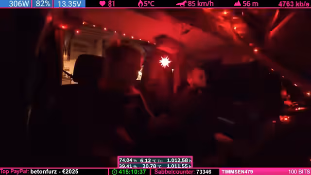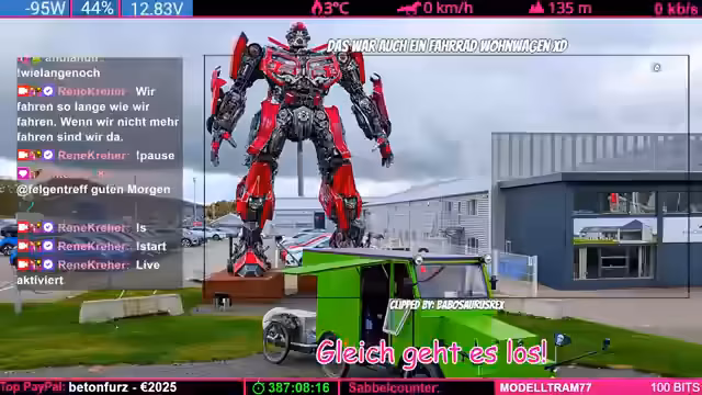 00:00:00Der Stream beginnt mit der Begeisterung über einen Fahrradwohnwagen, der live gesichtet wurde. Es folgen technische Vorbereitungen für die Reise, wie das Installieren von Kontrollpaneelen für Licht, Elektrik und Temperaturanzeige. Probleme mit dem Kreuzheben und dem Anbringen von Sicherheitskomponenten wie Rückfahrkamera und Hupen werden diskutiert. Die Stimmung ist humorvoll, aber es gibt Herausforderungen bei der Einrichtung der Ausrüstung, während die Reise von Nürnberg durch die Alpen geplant ist.