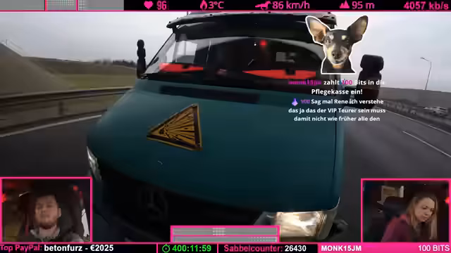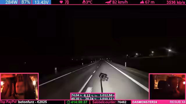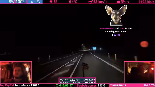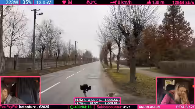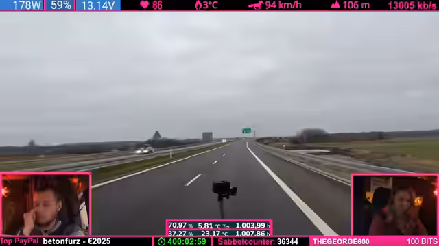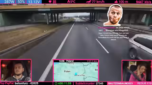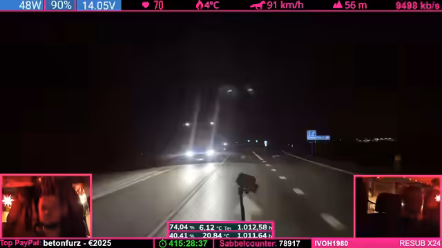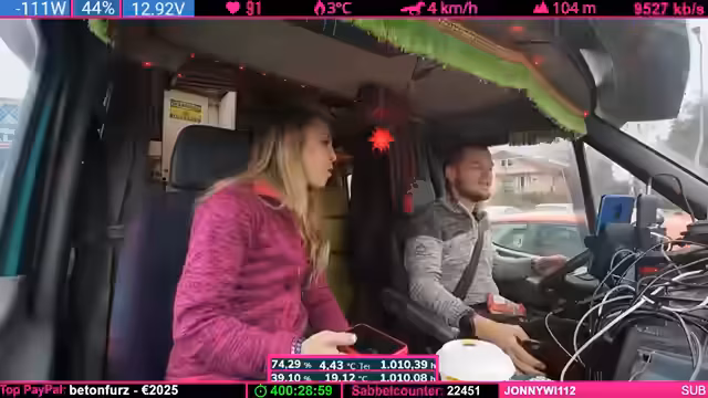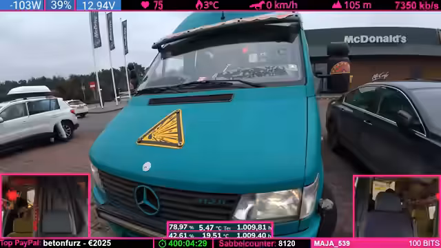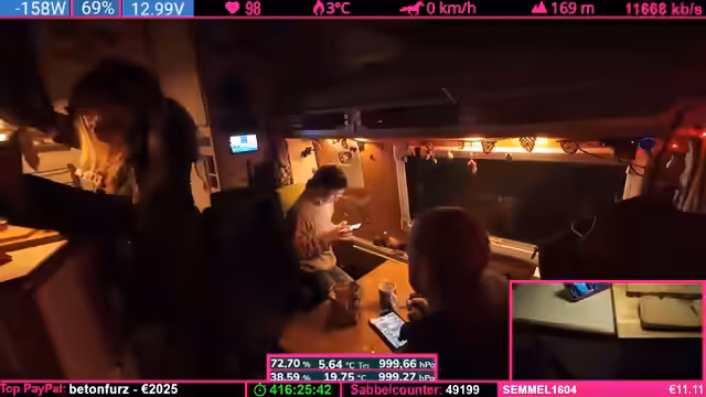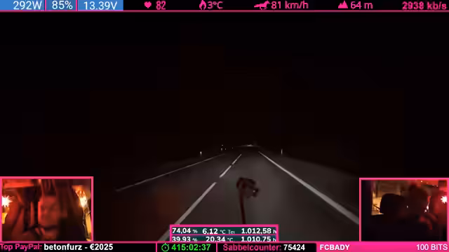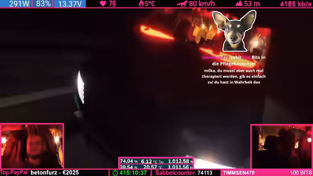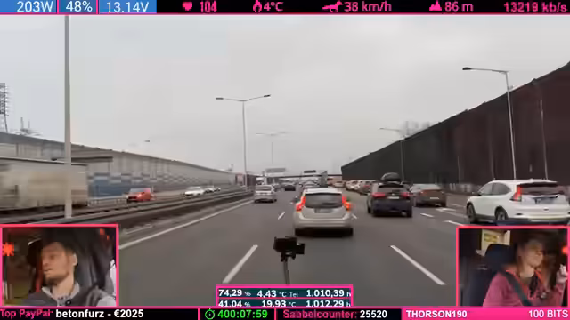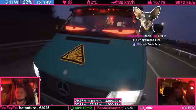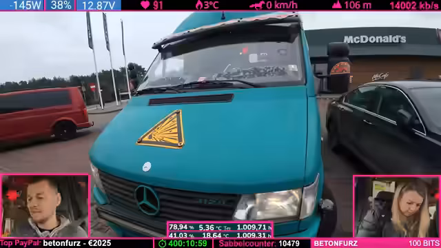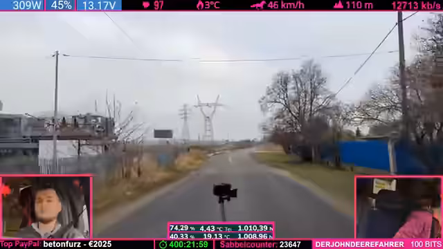 00:00:00Der Stream beginnt mit der Begeisterung über einen Fahrradwohnwagen, der live gesichtet wurde. Es folgen technische Vorbereitungen für die Reise, wie das Installieren von Kontrollpaneelen für Licht, Elektrik und Temperaturanzeige. Probleme mit dem Kreuzheben und dem Anbringen von Sicherheitskomponenten wie Rückfahrkamera und Hupen werden diskutiert. Die Stimmung ist humorvoll, aber es gibt Herausforderungen bei der Einrichtung der Ausrüstung, während die Reise von Nürnberg durch die Alpen geplant ist.