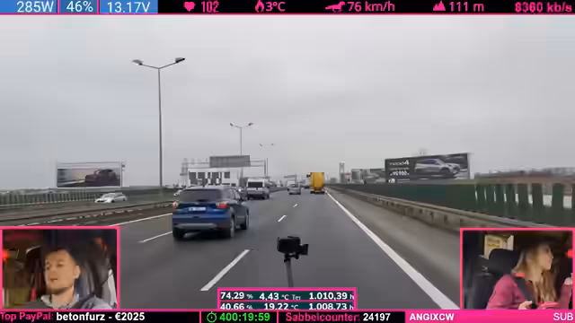 01:45:25Während der Fahrt kommt es zu kritischen technischen Pannen: Die Kamera löst sich und hängt nur noch am Kabelbinder, schleift unter dem Auto und droht zu brechen. Eine sofortige Reparatur wird erforderlich, wobei improvisierte Lösungen mit Kabelbindern und Klebeband diskutiert werden. Die Kamera wird notdürftig am Rahmen unter der Stoßstange befestigt, nachdem die ursprüngliche Montage einen schlechten Winkel bot. Zusätzlich leuchtet dauerhaft die Öldrucklampe, da der Sensor defekt ist – ein Risiko, da bei tatsächlichem Druckverlust keine Warnung erfolgt. Obwohl der Streamer betont, dass der Öldruck normal ist und das Geräusch bei Problemen hörbar wäre, plant er den Austausch des Teils. Die Stabilität der Lösung wird als ausreichend für die Weiterfahrt bewertet, solange keine weiteren äußeren Einwirkungen erfolgen.