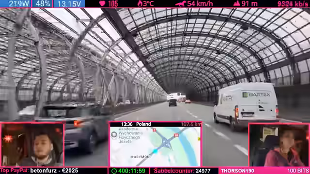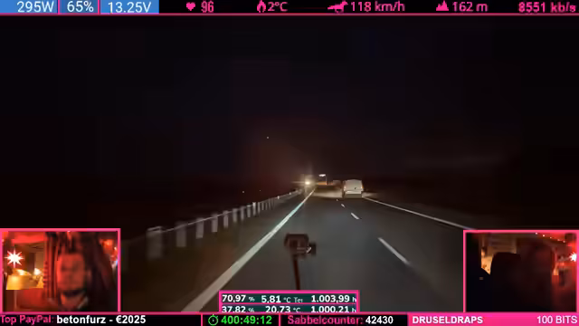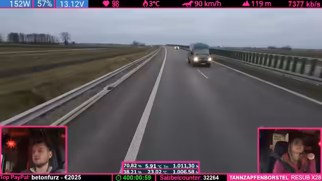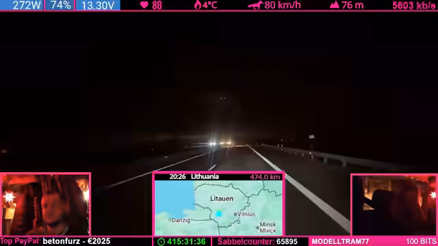 08:43:44Während der Fahrt durch Litauen kommt es zu Netzwerkproblemen durch den Wechsel von LTE auf Starlink. Die Nähe zu Russland (25 km entfernt) und Kaliningrad führt zu Verbindungsinstabilitäten. René erwähnt, dass Starlink in Russland möglicherweise nicht funktioniert, was aber für Litauen nicht relevant ist. Parallel wird der Grenzübertritt thematisiert: In Litauen gab es bisher keine Probleme, jedoch wird auf mögliche Hürden bei Einreisen in andere Länder hingewiesen. Der Stream-Titel wird von Zuschauern von 'Polen' auf 'Litauen' korrigiert.