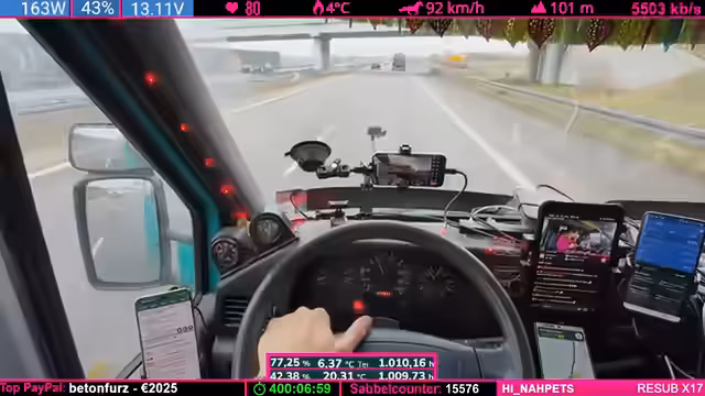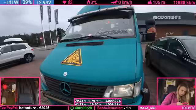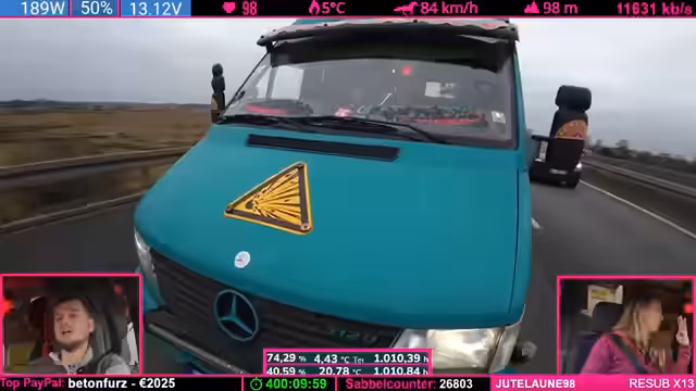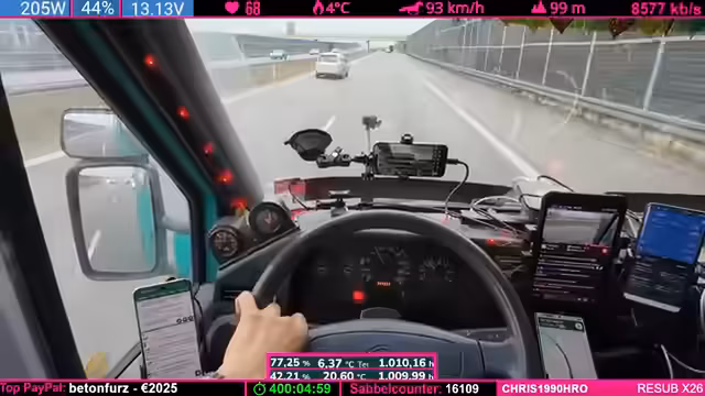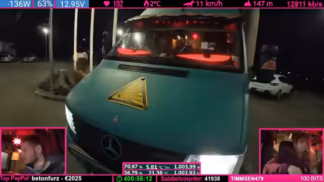 05:40:18Spenden werden gewürdigt, aber betont, dass finanzielle Unterstützung nicht nötig ist – die Gemeinschaft entstand durch gemeinsamen Austausch. Technische Aspekte während der Fahrt: Diskussion über unerwartet hohen Leerlaufverbrauch (184W), der auf den Kühlschrank und Zusatzgeräte zurückgeführt wird. Nach Abschaltung nicht benötigter Geräte normalisiert sich der Verbrauch auf 130W. Es wird über Kaffeeholen an Tankstellen nachgedacht, Zeitmanagement wird priorisiert.
