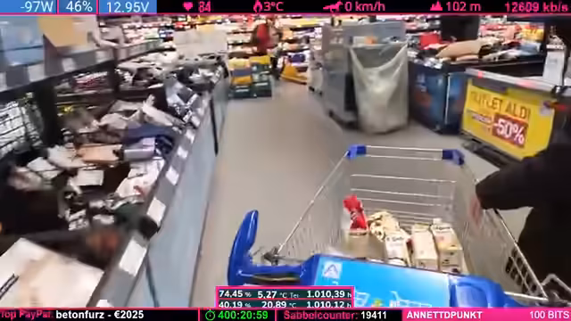 02:30:26Der Supermarkteinkauf wird gestartet, aber extreme Internetprobleme (fehlendes WLAN, hoher Packet-Loss) erschweren den Stream. Avocado-Qualität wird kritisiert – sie sind zu hart oder ungenießbar im Vergleich zu Skandinavien. Die Gruppe sucht nach Nüssen und Snacks, bemerkt aber ein mickriges Sortiment. Es wird versucht, die Bitrate zu reduzieren, um die Verbindung zu stabilisieren.