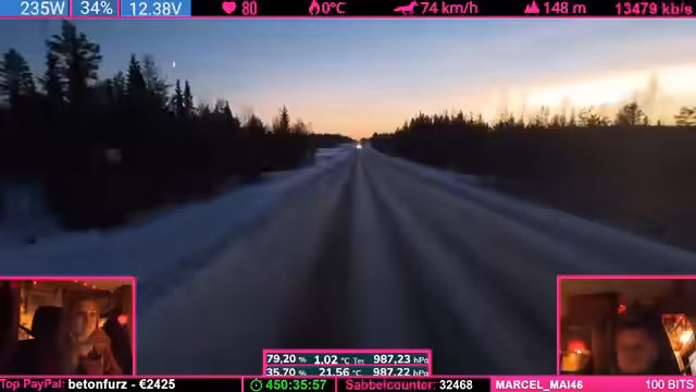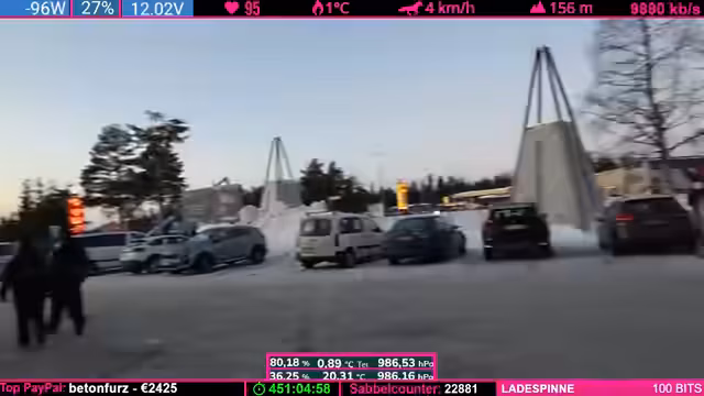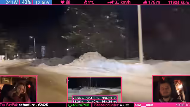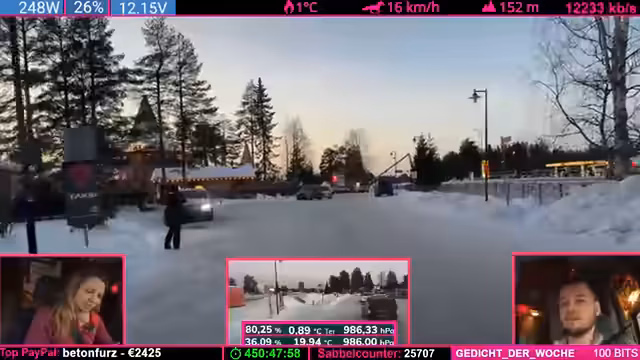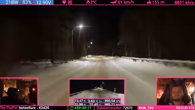 00:00:00Der Livestream beginnt mit einer chaotischen Phase bei der Fahrt durch die verschneite Landschaft. Der Streamer diskutiert technische Probleme mit seinem Fahrzeug, darunter eine beschädigte Holzkomponente und das festsitzende Schuhkarton-System. Die Community reagiert mit Hype-Trains und Spenden, während versucht wird, die Probleme zu lösen. Es gibt Diskussionen über die Montage von Gummi-Streifen und die Handhabung der Ausrüstung. Die Stimmung ist angespannt, aber voller Tatendrang, die Herausforderungen zu meistern.