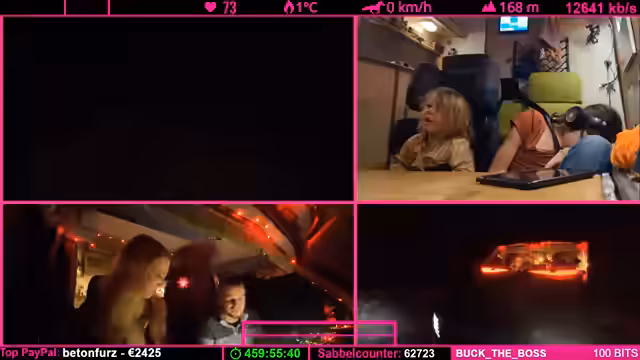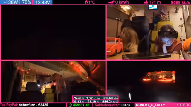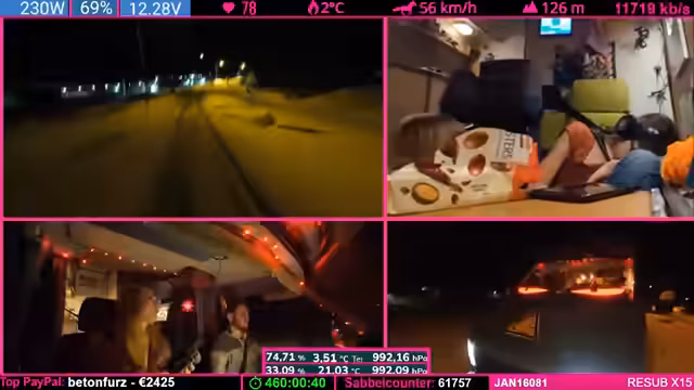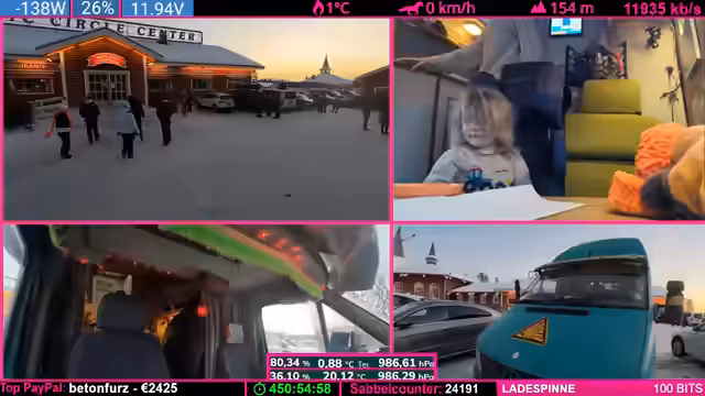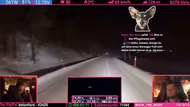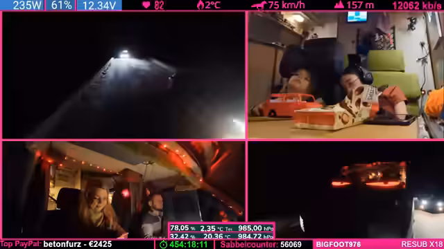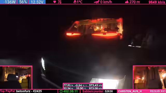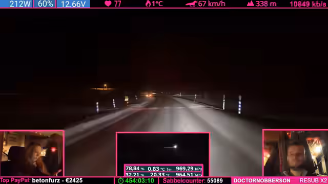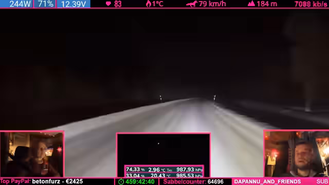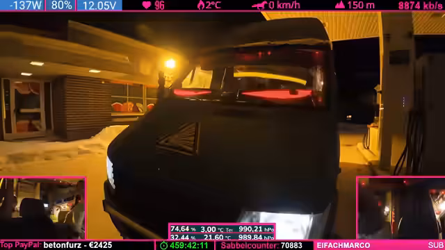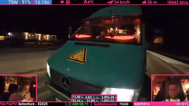 07:37:48Der Tankstand wird besprochen: Noch fast ein halber Tank, aber aufgrund der Fahrzeugform leert sich das letzte Drittel schneller. Starlink wird als „Game Changer“ für Internetverbindung in Flugzeugen und Schiffen gelobt. Parallel werden Geräte (Ladegeräte, Lampen) geladen, wobei die Kälte das Laden erschwert. Ein Zuschauer spendet 100 Bits für die „Pflegekasse“.