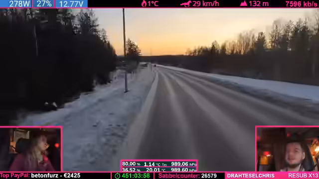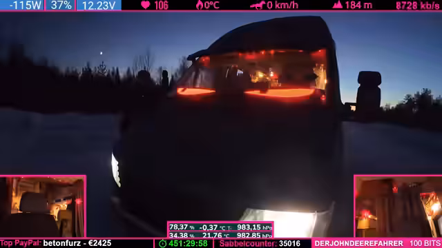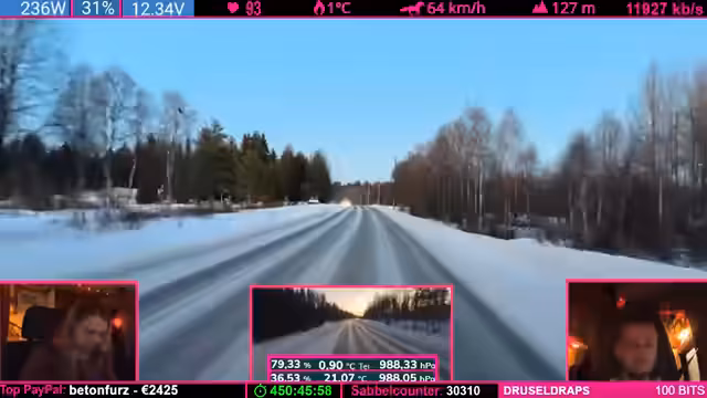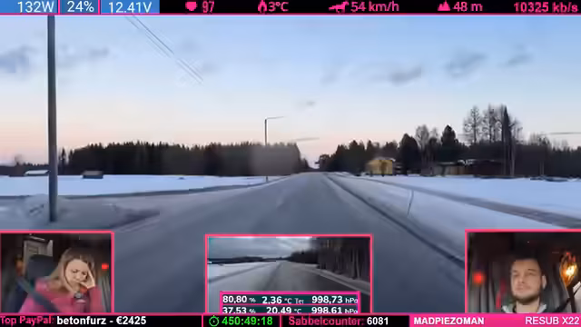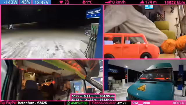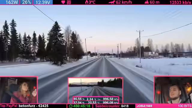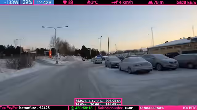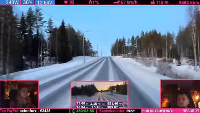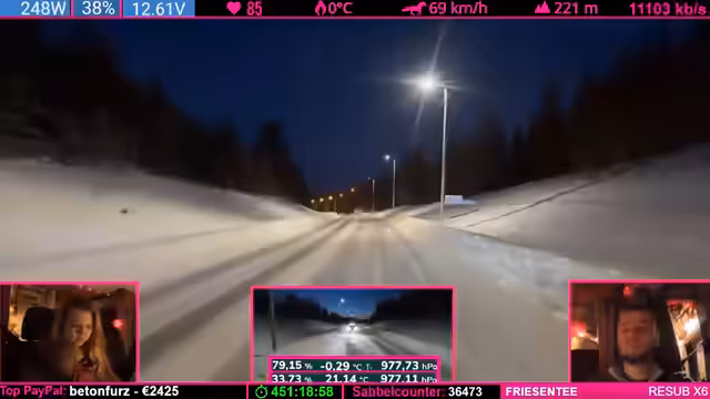 04:24:07Während der Fahrt durch die winterliche finnische Landschaft beschreibt der Streamer das Gefühl eines echten Winterabenteuers, insbesondere am Nordkap, wo unvorhergesehene Ereignisse wie plötzliche Windänderungen eintreten können. Er äußert die Ansicht, es sei besser, weniger belebte Ziele anzusteuern. Gleichzeitig erwähnt er technische Aspekte der Fahrt, einen ruckelnden LTE-Empfang und eine Running-Kamera, die aber für die Live-Übertragung ausreicht. Der Fokus liegt auf der атмосфäre des Reisens und der unvorhersehbaren Natur.