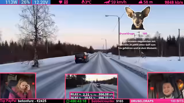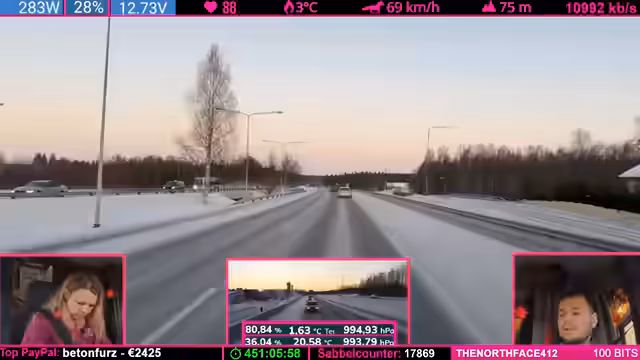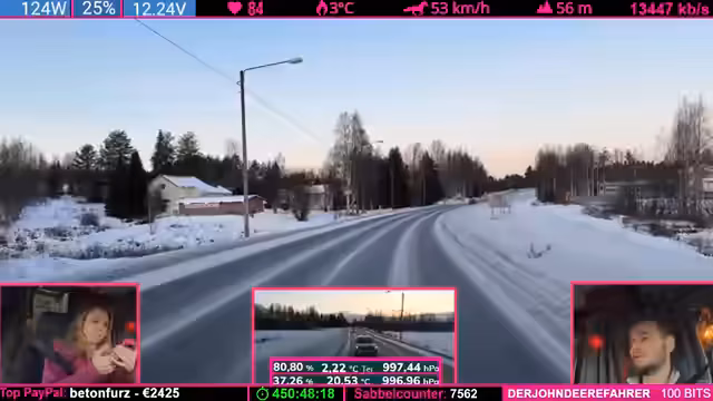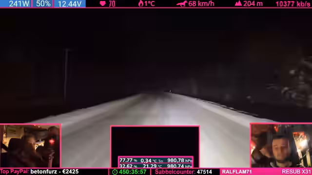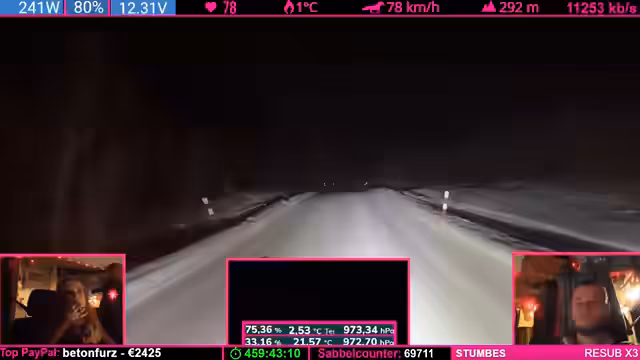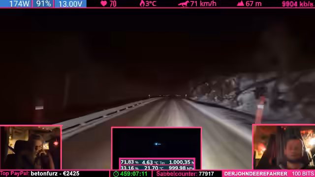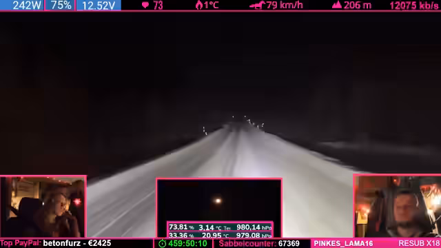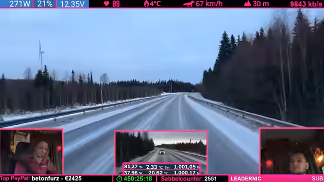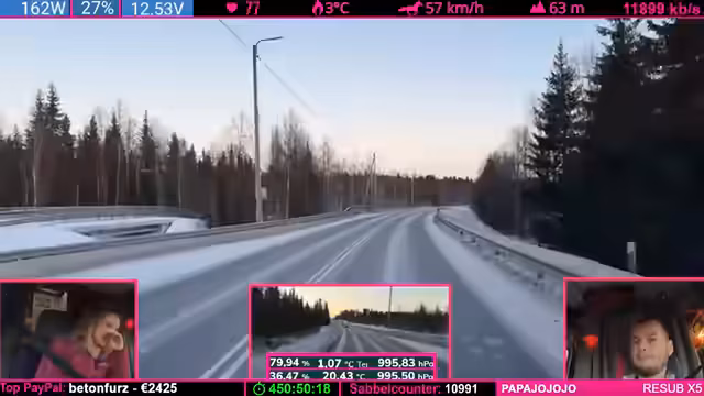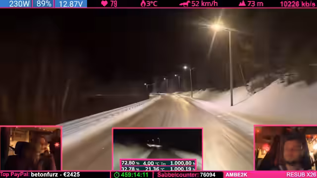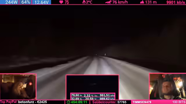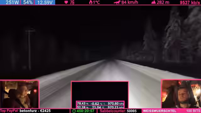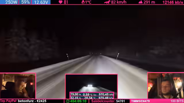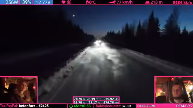 08:14:04Die Strecke wird anspruchsvoller: Kurvenreiche, bergige Passagen („wie auf dem Nürburgring“) zwingen zu Tempo 50-60 km/h. Der Schnee schmilzt (4°C), wodurch nasse, vereiste Stellen entstehen („Antauen-Gefrieren-Zyklus“). Dies macht das Fahren mühsam. Parallele Spenden (z.B. „Frederik“) werden trotz Konzentrationsnotwendigkeit erwähnt.