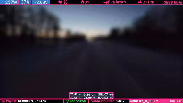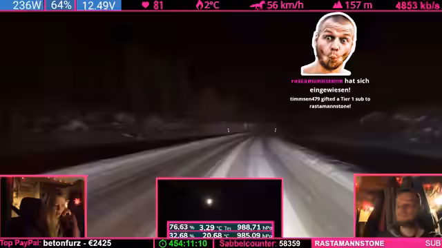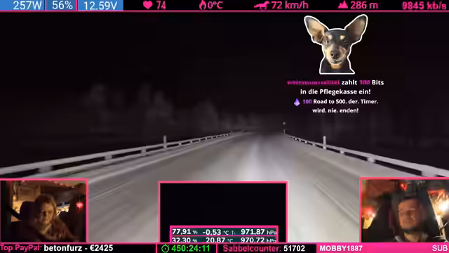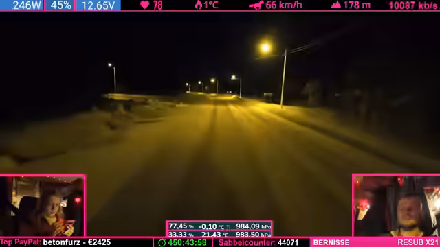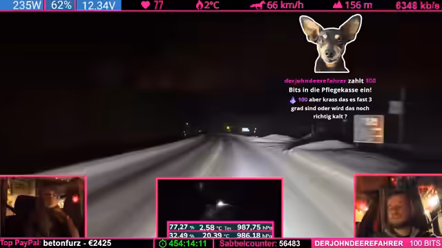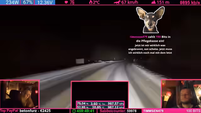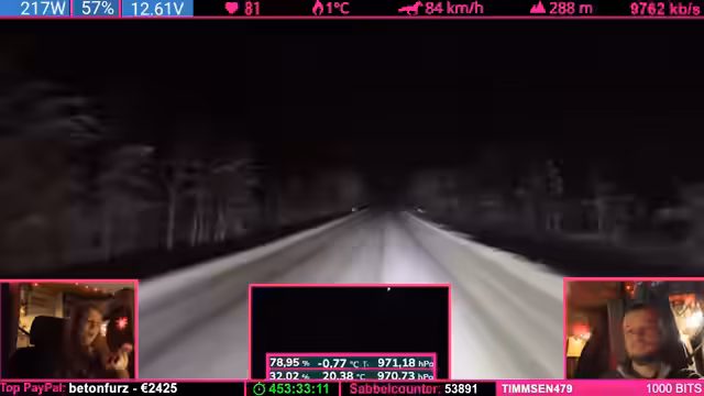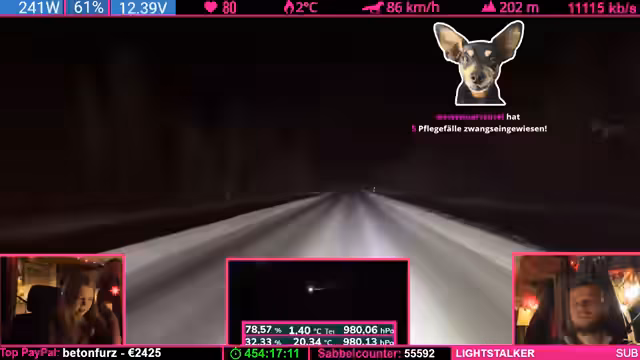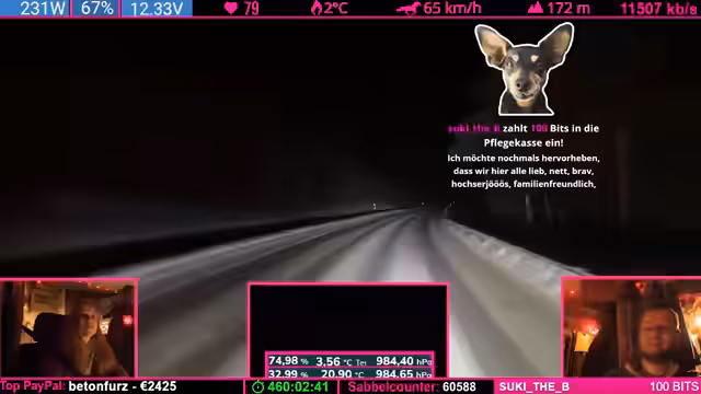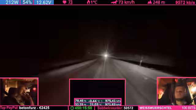 07:42:24Nach einer übertriebenen Äußerung des Streamers („Was soll Helge schon wegpusten?“) trifft eine starke Windböe das Fahrzeug und schiebt es seitlich. Der Streamer gibt zu, dass sein „Riskanter“-Gerede bestraft wurde. Witze über Helge (ein wahrscheinlich anwesendes Familienmitglied) und Drohungen mit „Nackenschellen“ dominieren die Stimmung. Es folgen Spenden (u.a. 1.000 Bits) und Erwähnungen von „Pflegefällen“ (Community-Begriff für Spender).