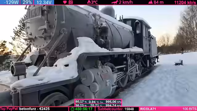 01:42:24Bei der Beobachtung eines Zuges kommt es zu einer gefährlichen Situation, als ein Autofahrer rechts überholen und dabei fast den Streamer rammt. Anschließend wird eine alte Diesellok im Schnee erkundet, wobei die Tochter trotz tiefer Schneeverhältnisse und Hindernissen die Lok erreicht. Die Beschreibung hebt die technischen Details der Lok wie Zylinder und Kompressor hervor sowie die Herausforderungen beim Fotografieren in der Kälte. Das Abenteuer endet mit dem Aufbruch zum Weihnachtsmannendorf unter Hinweisen auf glatte Straßen.