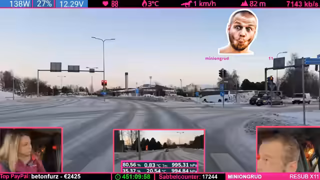 10:28:11Nachdem die Internetverbindung wieder hergestellt ist, fährt der Streamer weiter und beschreibt die schwierigen Fahrbedingungen. Die Straßen sind rutschig und teilweise von einer dünnen Eisschicht bedeckt, die durch ungewöhnlich warmes Wetter entstanden ist. Es werden erneut Bremsmanöver durchgeführt, um die Glätte zu testen, und es wird deutlich, dass selbst mit gestreutem Splitt die Fahrt gefährlich ist. Der Streamer warnt vor den Risiken und der Notwendigkeit, äußerst vorsichtig mit Gas, Bremse und Lenkung umzugehen.