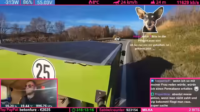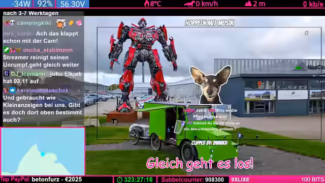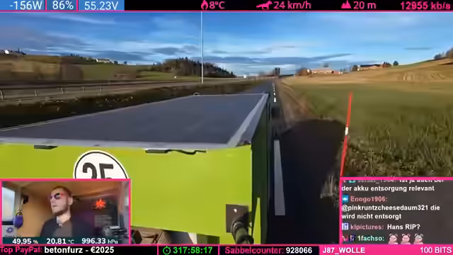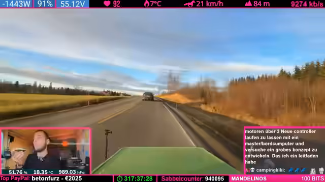 13:34:15Als kurzfristige Lösung soll das Fahrradwohnmobil nun im sogenannten Single-Drive-Modus weiterfahren, bei dem jeder Motor einen eigenen, unabhängigen Controller nutzt. Dafür wird ein neuer Controller eingebaut, der bereits gespendet wurde. Der Streamer zeigt sich gegenüber dem Analytiker 'Obi' sehr dankbar, da dessen professionelle Laboranalyse die Thesen des Streamers bestätigt hat. Er hebt hervor, dass Obi auf eine intelligente und ehrliche Weise kommuniziert, im Gegensatz zu anderen Experten.