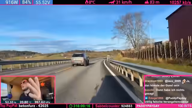 00:05:16Auf einem Fährhafen lernt der Streamer einen deutschen Fahrer eines selbstgebauten Fahrradwohnmobils kennen. In einem ausführlichen Austausch auf Deutsch und Englisch tauschen sie sich über die Fahrzeuge aus. Der andere Erbauer zeigt sein auf 12 Stunden Fahrt ausgelegtes Fahrzeug mit integriertem Generator und erzählt von seiner Route und den unterschiedlichen Erfahrungen mit dem Verkehr in Schweden und Norwegen.