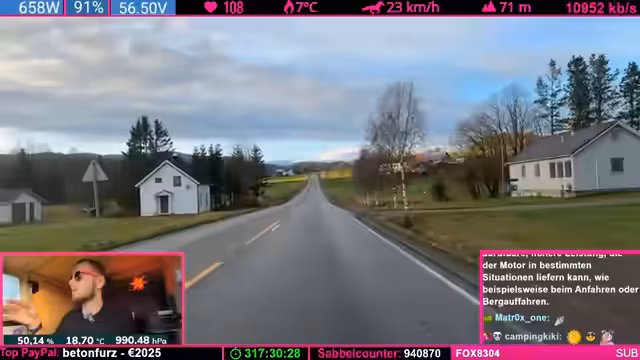 11:37:18Nach dem Tankstopp fährt der Streamer weiter auf der norwegischen FV17, eine als besonders schöne empfundene Straße. Er plant, so lange wie möglich zu fahren und sucht nach einem Schlafplatz, sobald es dunkel wird und keine Restlicht mehr gibt. Er erwähnt den geringen Verkehr auf der Straße und die beeindruckende Berglandschaft, die noch vor ihm liegt.