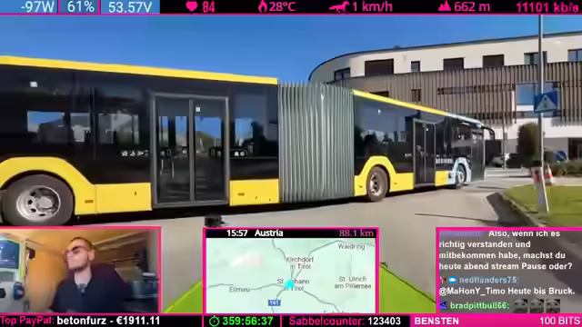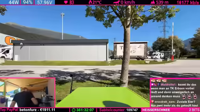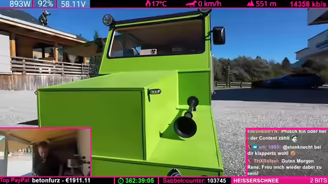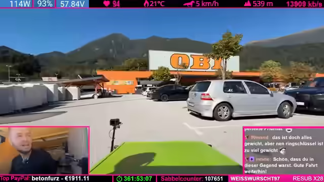 00:09:34Es gab anfängliche Verwirrung bezüglich der Fahrtrichtung in Bezug auf den Flughafen Innsbruck. Ein bereitgestellter Link führte möglicherweise zu einer falschen Position, da der Streamer bereits durch Innsbruck gefahren war, während der Link in die entgegengesetzte Richtung wies. Es wird die Notwendigkeit betont, eine Ladestation zu finden, idealerweise in der Nähe eines Obi-Baumarkts, um auch Werkzeug für Reparaturen am Kettenantrieb zu besorgen. Ein Zuschauer schlug eine Ladestation bei McDonalds vor, aber diese Option wurde als weniger ideal angesehen. Es wird die Hoffnung geäußert, dass der Strom bis zum Obi reicht. Ein anderer Zuschauer schlägt eine alternative Ladesäule in zwölf Kilometern Entfernung vor, die aber nur in Betracht gezogen wird, wenn sie ruhiger gelegen ist. Es wird die Vorliebe für ruhige Orte zum Frühstücken und Streamen betont. Die Reichweite zum Obi wird als machbar eingeschätzt, und es wird die Möglichkeit erwähnt, bei Bedarf umzusteuern. Starlink wird vorerst ausgeschaltet gelassen, da sich der Streamer in einem dicht besiedelten Gebiet befindet.