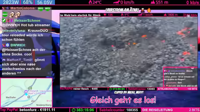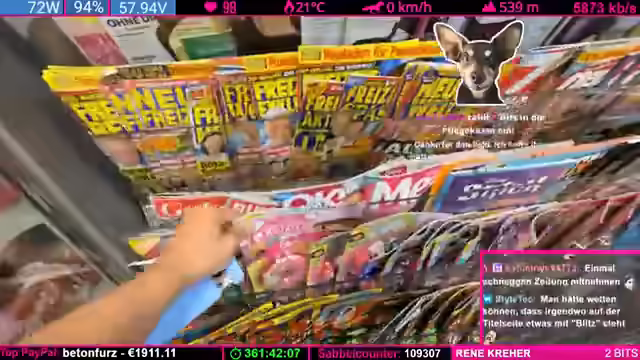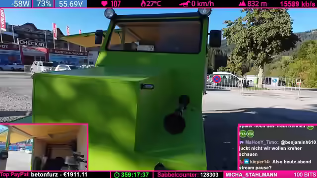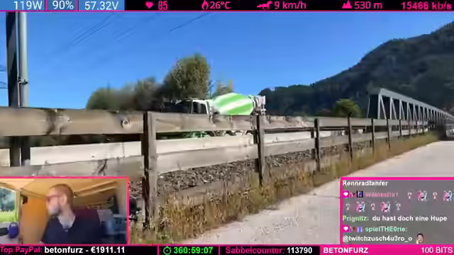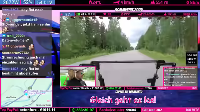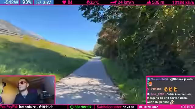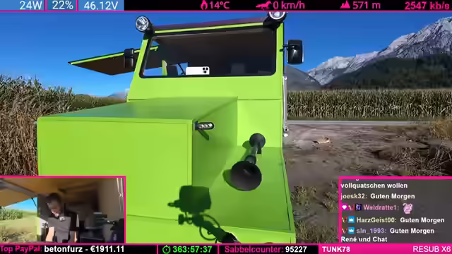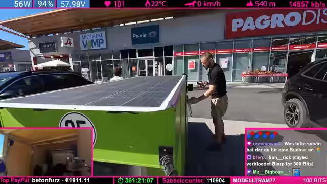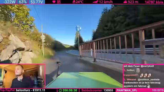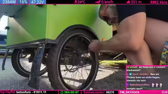 05:33:27Es wird darüber gesprochen, was bei der Panne gefixt wurde, darunter Platten, abgerissenes Kettenleitrad und kaputte Controller. Andreas hat eine neue Route mit zusätzlichen 1000 Kilometern erstellt, die zeittechnisch durchgerechnet werden muss. Es wird über die Navigation mit Komoot diskutiert, wobei es zu Problemen und Fehlleitungen kommt, die für Frustration sorgen. Es werden Zuschauer für ihre Unterstützung und Spenden gedankt. Es wird über die Größe von Frankestein diskutiert, basierend auf einem Foto im Discord. Es wird überlegt, den Luftdruck an einer Tankstelle zu prüfen, um sich das Pumpen mit der Handpumpe zu sparen. Es wird ein Layer-8-Problem mit der Pumpe vermutet, das aber behoben werden konnte. Es wird die Stabilität des SRTLA-Servers gelobt. Es wird die Innentemperatur von Frankenstein gemessen und mit der Außentemperatur verglichen. Es wird über den Stromverbrauch diskutiert und die verbleibende Reichweite berechnet. Es wird kurz der Warpantrieb aktiviert, um einen Berg zu erklimmen.
