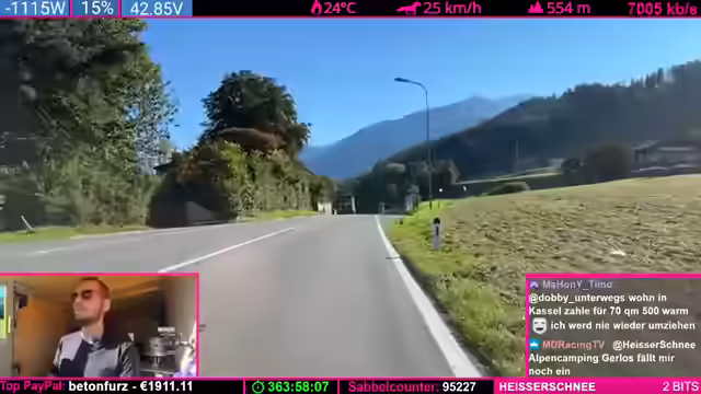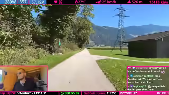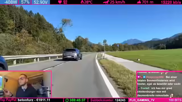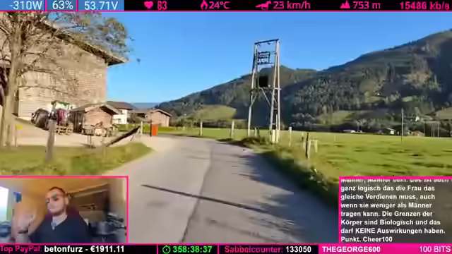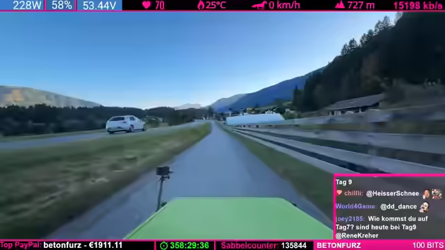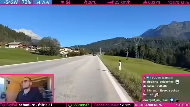 05:02:50Es werden humorvolle Kommentare zu Radfahrern abgegeben und mit Timeouts versehen. Die Freude über die Beta von Bettelfind wird ausgedrückt, wobei die alten Battlefield-Teile bevorzugt werden. Es wird von Erfahrungen als Helikopterpilot in Battlefield berichtet, wo der Streamer für seine Spielweise bekannt war. Es wird über das Fahren in den Alpen philosophiert, das Atmen der Luft, das Betrachten der Landschaft und die kleinen Herausforderungen. Es werden physikalische Grundkenntnisse über Weitwinkelkameras erläutert und deren Einfluss auf das Geschwindigkeitsgefühl. Es werden Anekdoten über Kaffeetrinken bei Oma und Bingo spielen bei Tante Hilde erzählt. Es wird die Problematik von dummen Absperrungen und unkooperativen Menschen angesprochen, die den Weg versperren. Es wird die Hilfsbereitschaft eines Mannes gelobt, der beim Passieren einer Engstelle hilft. Es wird über das Speichengeräusch von Frankenstein diskutiert und die Hoffnung geäußert, dass es sich nur um ein einmaliges Setzen handelt. Es wird ein Waldarbeiter gegrüßt, der den Streamer mit einer teuren Kamera gefilmt hat. Es werden Zuschauer für Spenden und Unterstützung gedankt.