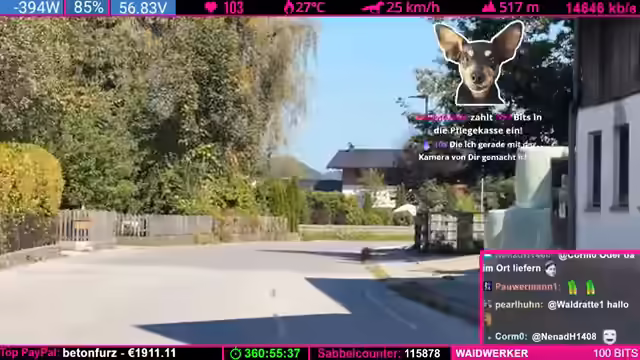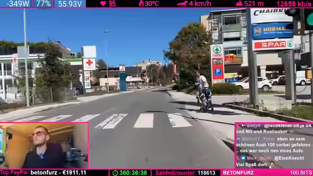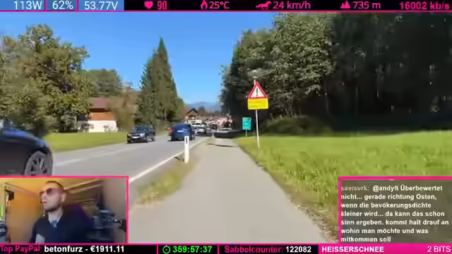 04:41:45Die Radwegbeschaffenheit wird positiv hervorgehoben, insbesondere die Topfhaltung für das Equipment. Es wird die Auseinandersetzung mit unaufmerksamen Verkehrsteilnehmern thematisiert, die trotz Hupens nicht reagieren. Die Dummheit und Rücksichtslosigkeit mancher Verkehrsteilnehmer wird kritisiert und mit einem Bergwerkspruch kommentiert. Es wird festgestellt, dass bisher alles an Frankenstein wieder hingekriegt wurde. Es wird über die Problematik von Zuschauern mit doppelten Streams oder fehlerhaften Einstellungen diskutiert, die dann fälschlicherweise Tonprobleme melden. Die Schwierigkeiten mit Radfahrern, die sich als Könige des Radwegs aufführen und andere gefährden, werden angesprochen, sowie die psychologischen Hintergründe für solches Verhalten, wie das Aufwerten des eigenen Selbstwertgefühls durch Statussymbole wie teure Autos. Es wird erwähnt, dass man sich auch selbst anhand von dem bewertet, was man hat und leistet. Es wird die Nutzung von Starlink-Internet thematisiert, wobei festgestellt wird, dass es in offenen Bereichen besser funktioniert als in bewaldeten Gebieten, wo es die Bitrate beeinträchtigen kann.