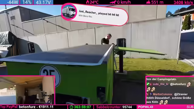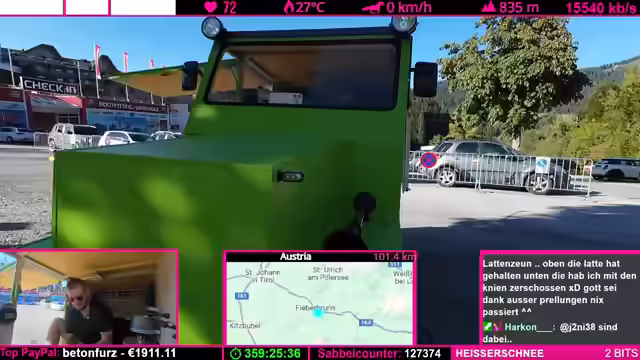 01:33:45Ein Zuschauer namens Thomas bringt Corona mit und wird freundlich begrüßt. Es wird überlegt, ob ein Dampferladen für Heats besucht werden soll, da kein Gerät vorhanden ist. Eventuell wird auch eine neue Sonnenbrille gekauft. In der Nähe befindet sich eine Touristenattraktion mit einem verkehrten Haus, das besichtigt wird. Dabei wird ein Fehler an einem Klimakompressor der Wärmepumpe entdeckt. Thomas wird für seine nette Geste gedankt und verabschiedet. Es wird überlegt, ob das mitgebrachte Corona noch am selben Abend getrunken wird oder für den nächsten Tag aufgehoben wird. Die Stimme beginnt wieder zu versagen, ähnlich wie beim letzten Mal. Es wird über eine Bubble-Pause nachgedacht, da eine leichte Verrotzung aufgrund von Allergien besteht. Eine Spinne baut ein Netz über die Kamera. Es gibt Probleme mit dem Internet, und Starlink wird aktiviert, da die Clips nicht durchgehen. Es stellt sich heraus, dass die Verbindung gedrosselt ist, obwohl voller A1-Empfang besteht.