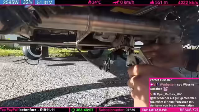 01:01:07Die Ladesäule lässt sich aktivieren, aber der Adapter funktioniert zunächst nicht wie erwartet. Durch eine andere Schalterkonstellation gelingt es schließlich, den Strom freizuschalten. Der Streamer ist erleichtert, den richtigen Stecker zu haben, da ein anderer möglicherweise nicht funktioniert hätte. Während des Aufladens werden die Reifen inspiziert. Es wird festgestellt, dass der Reifendruck etwas niedrig ist, und Luft wird nachgepumpt. Es wird vermutet, dass ein kleines Loch im Reifen vorhanden sein könnte. Der Streamer betrachtet das Aufpumpen der Reifen als Morgensport. Der Zustand des Diffs wird überprüft, und es wird festgestellt, dass es sich leicht verschoben hat. Es wird vermutet, dass die rechte Seite betroffen ist. Der Streamer sieht darin eine Fehlkonstruktion, da sich die Teile trotz fester Fixierung verschieben. Er plant, sich etwas einfallen zu lassen, um das Problem zu beheben, und erwägt, Steffen um Rat zu fragen. Das Spiel des Diffs wird überprüft. Es wird festgestellt, dass der Mitnehmer etwas zu weit rechts sitzt und mit einer Unterlegscheibe korrigiert werden könnte. Dies soll beim Baumarktbesuch erledigt werden.