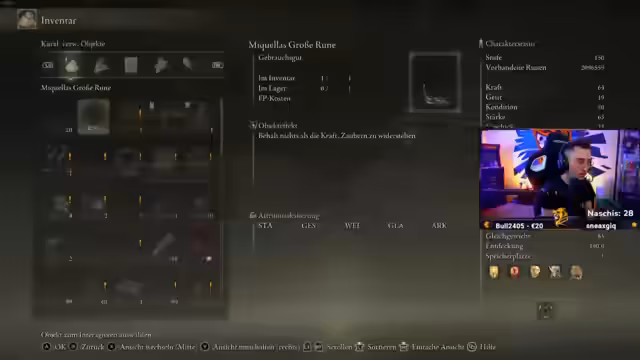03:14:45Der Stream konzentriert sich auf die detaillierte Untersuchung von Spielmechaniken in Elden Ring. Es werden große Runen und deren speziellen Effekte diskutiert. Die Nachnutzung von Items wie Umarmungen wird hinterfragt, ob sie einmalig oder unendlich verfügbar sind. Es folgt die Analyse verschiediger Bossfähigkeiten, insbesondere die schweren Magieschäden von 'Träumen wurden'. Ein Stärke- und Verteidigungsbuild wird bewertet, wobei festgestellt wird, dass die Haltung des Gegers trotz hohem Schaden nicht gebrochen wurde.