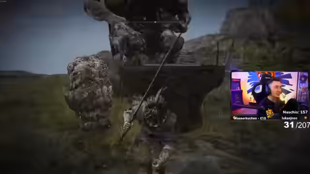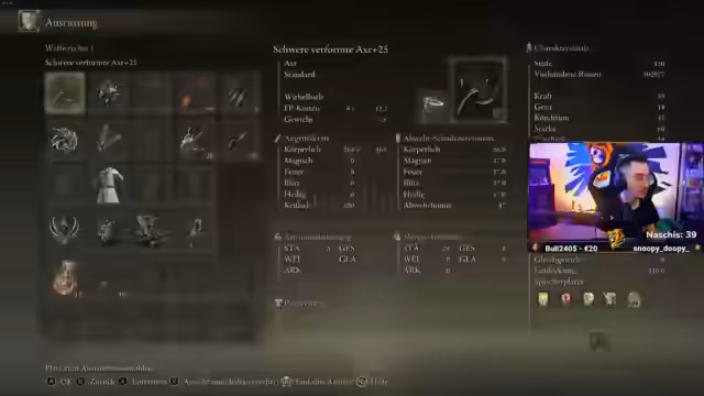 00:12:01Der Streamer enthüllt seine Pläne für einen PvP-Account in Elden Ring, der auf einem Build mit drei Waffen basiert: einer starken Axt, einem Golem-Großbogen und einem Greatsword. Er betont die Stärke dieses Builds, gibt aber an, dass er massive Mengen an Verbrauchsitems wie Pfeile, Bolzen und vor allem an Fäden benötigt, um effektive Zauber auszuführen. Er sucht aktiv nach einem Zuschauer, der ihm diese Gegenstände massiv zur Verfügung stellen kann.