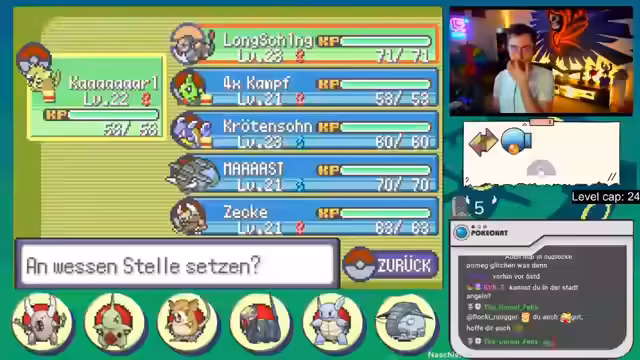 07:16:34Nach 7 Stunden Streaming bemerkt der Streamer Unbehagen bei den Airpods und hat nahtlos ein Headset parat, um umzustecken. Während des Spiels wird über die starken und schwachen Punkte der Pokémon gesprochen, wie der Boden-Psycho-Typ von Z-Trümmerer. Der Streamer erkundet verschiedene Routen und kämpft gegen Trainer, wobei er oft auf Probleme mit dem Levelunterschied und der mangelnden Vielfalt im Team stößt. Er stellt fest, dass manche Pokémon wie Pinsir sehr schlecht im Moveset sind.